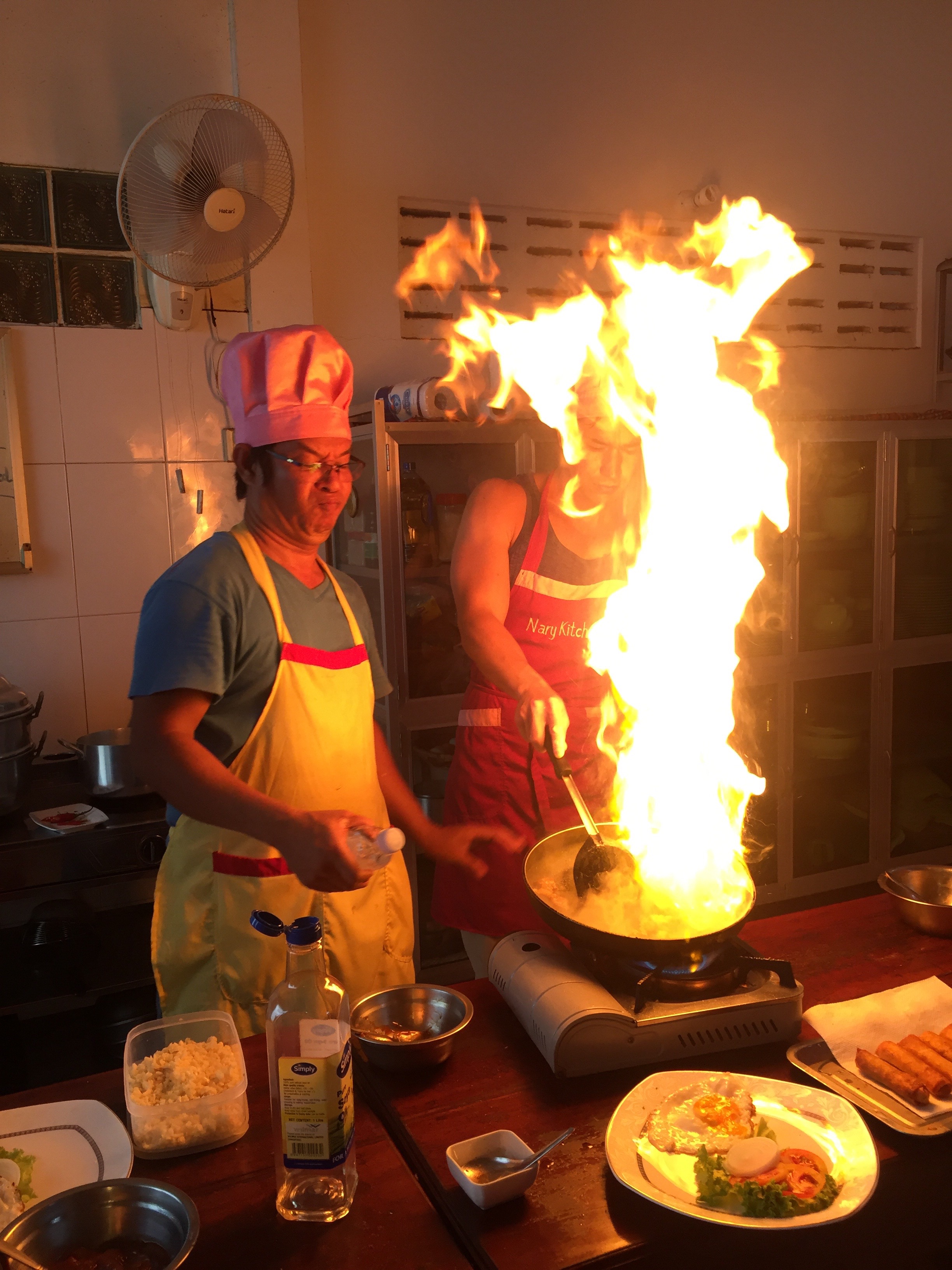 We took a cooking class in traditional Cambodian cuisine. Toward the end, each person got to cook a dish called Lok Lak; flash-fried meat or vegetables in a homemade sauce. The chef warned us ahead of time that “there might be a little bit of fire” in the pan, but that it was nothing to worry about.