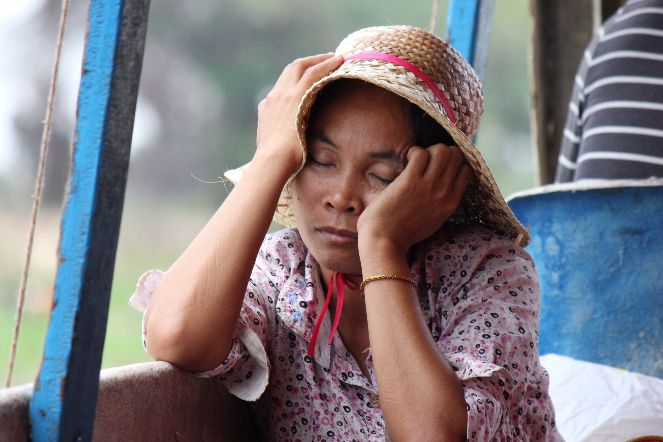 Napping on a boat, Tonle Sap lake, Cambodia. She kept this position for at least twenty minutes, despite the rocking of the boat, the forward and backward thrust, the echoes of the absurdly loud engines screaming past us. There was also something of the anguish of Cambodia in her features – if she’d had her mouth open, I might have called this “The Scream.”