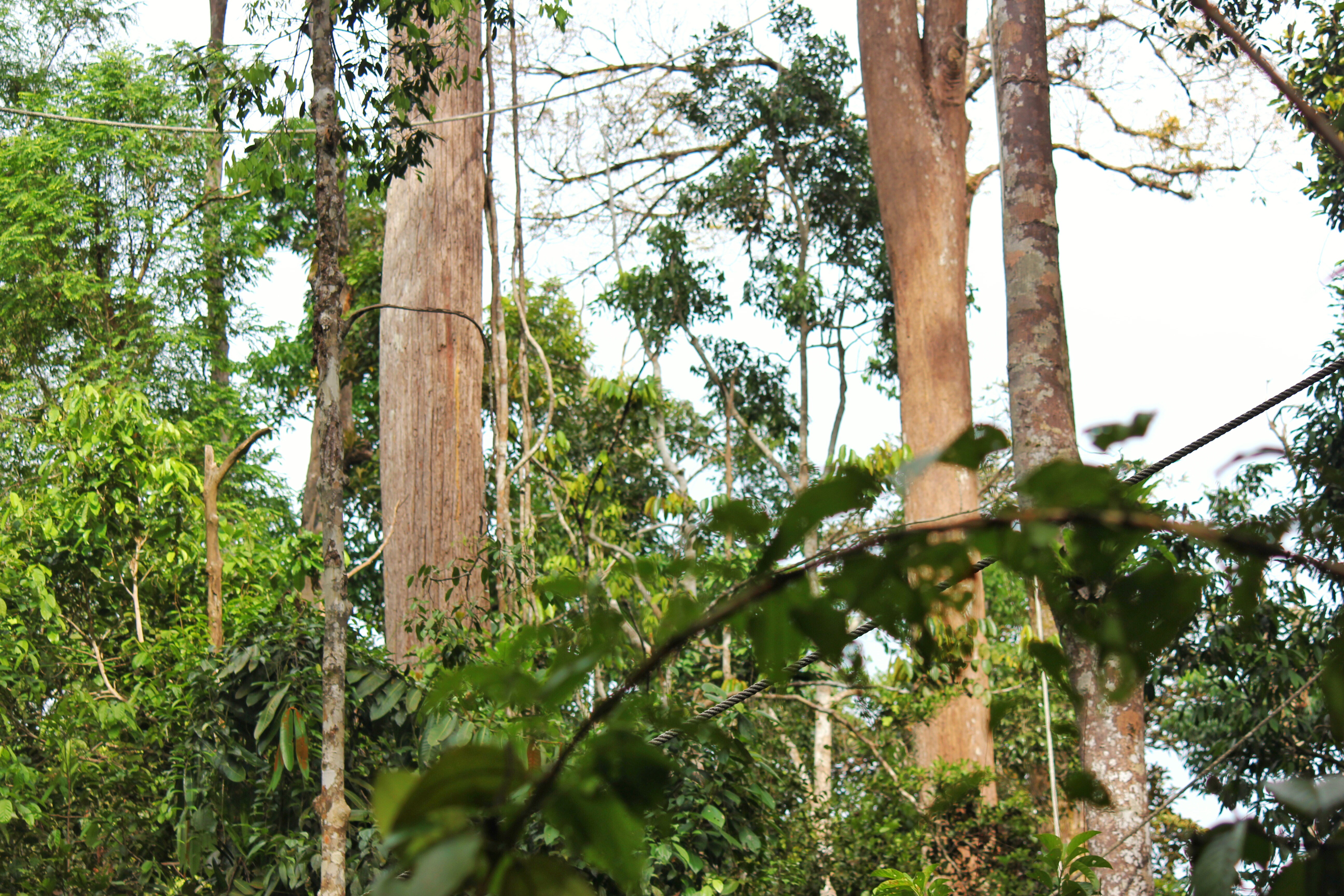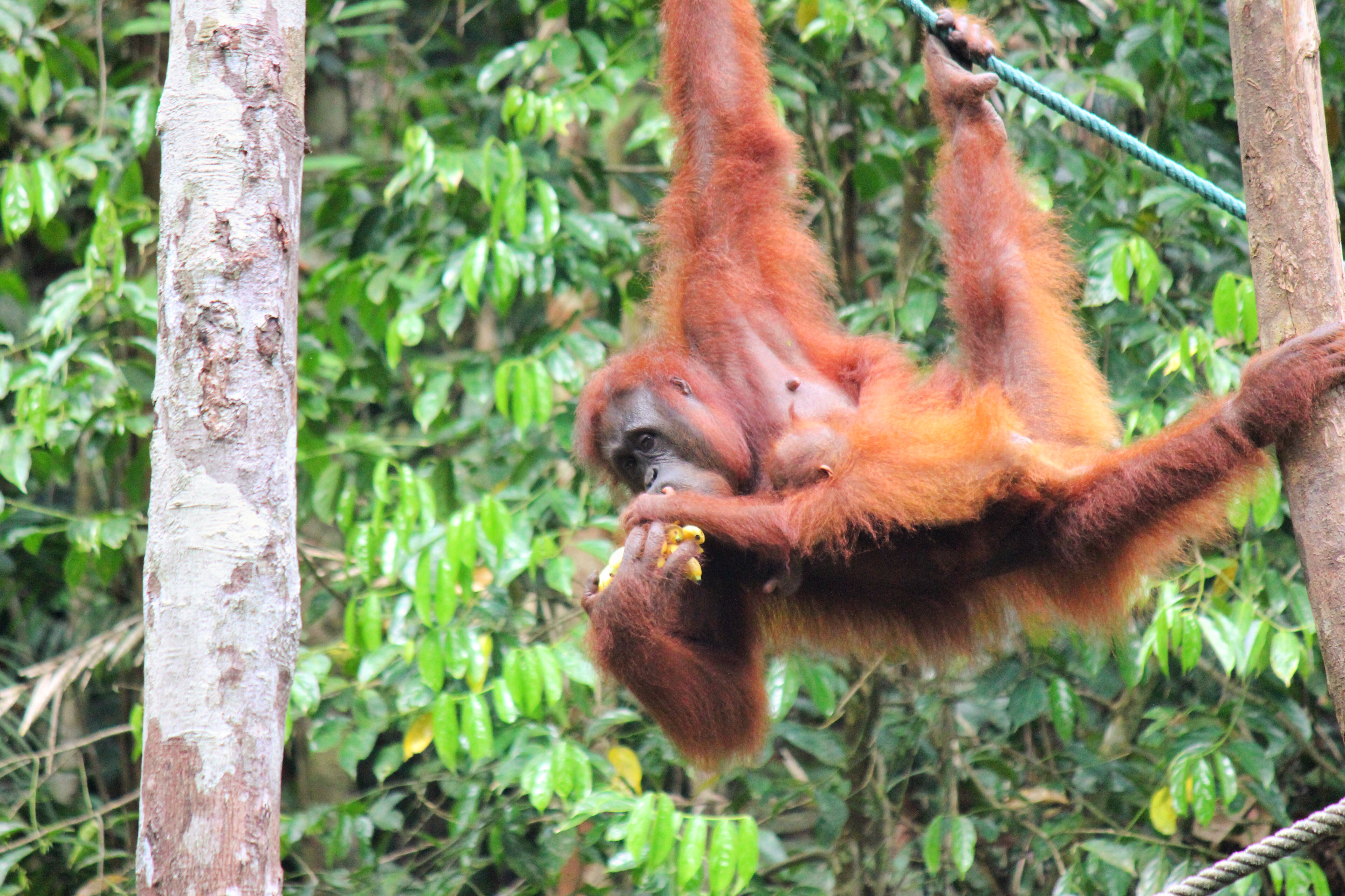 And as you’re captivated by this universally adorable display of motherhood, a tree shakes, and everyone – your group, the ranger, the mother, the baby – looks over. The mother seems to know better than anyone what is happening, and reaches down; the ranger throws up a coconut, which she holds in her foot, and then a piece of durian, which she holds in her teeth. Then, with her remaining limbs, she climbs and climbs and climbs and swings into a tree branch, and when you look back to where the trees were shaking, you see a giant male, completely still, hanging from a rope.