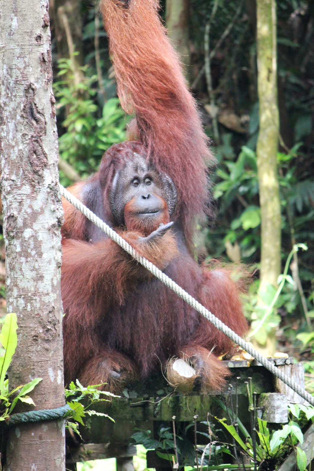 The orangutan swings down to where the fruit has been placed by the rangers and sways above it. A ranger walks over, confident but cautious, and the orangutan’s hand reaches out, maybe three meters above the fruit, waiting. The ranger knows the drill, and tosses a bunch of bananas up, which the orangutan catches and immediately starts devouring, one by one. They are tiny bananas, the kinds you can eat in a single bite. He twists one off, peels it, then smashes it into his mouth whole, pretty much the same way you do, except your wife tells you it gives her indigestion to watch you eat like that, but when an orangutan does it it’s “natural.” He drops the skins casually to the ground. When he’s done with the whole bunch – maybe 25 bananas – he reaches down again, and a durian chunk is thrown up to his waiting hand. He lifts it to his mouth and takes a bite, the something falls out of his mouth and hits the wood below with a ping. This is repeated for every giant durian seed, and you long to have one as a souvenir to give to your niece and nephew. “Here’s a durian seed,” you would say. “It’s a fruit that smells like vomit and is banned from most hotels in Southeast Asia. An orangutan spit it out, and I grabbed it for you.” They’re young, and you’d be a hero. But you can’t go and get one, so you take pictures.