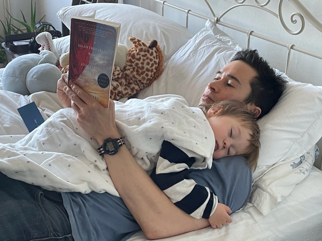 This moment: the way his breathing pushed his belly down, the scratch of his nails as he gripped my shirt, how my shoulder fit into the indentation in the side of his head, how soft his cheek was, and how I had to stifle laughs so I didn’t wake him.