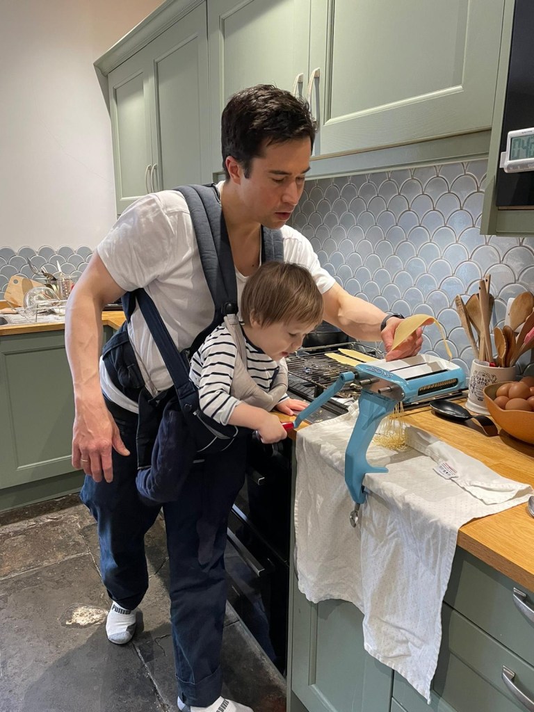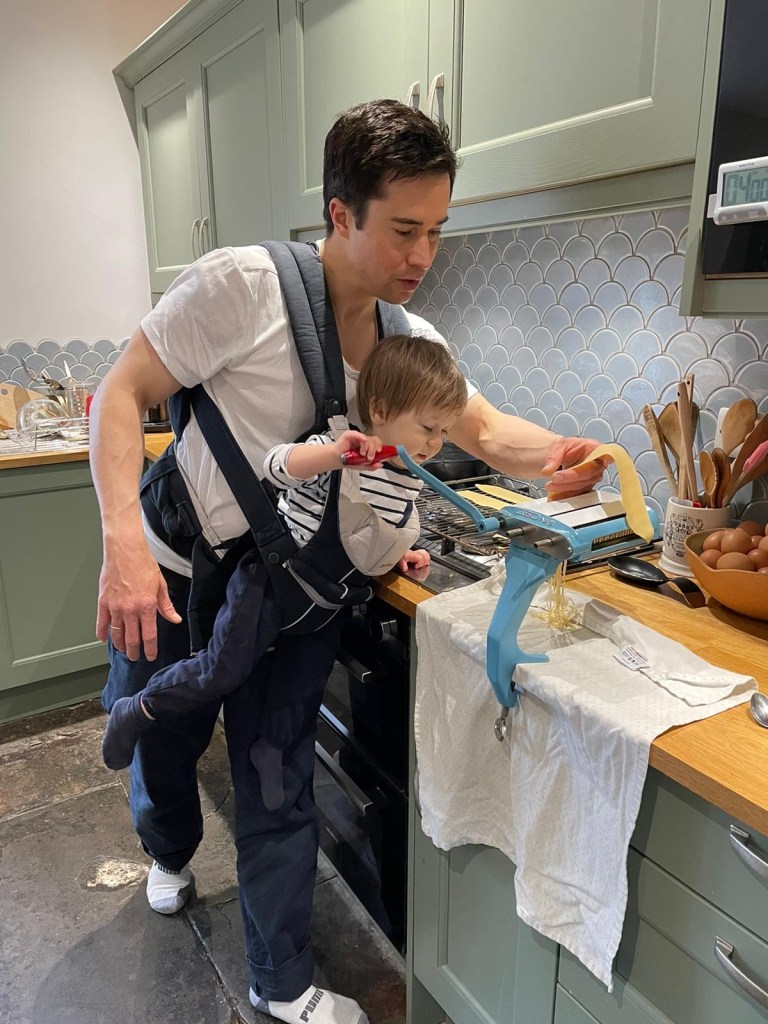 And now, he likes turning the pasta crank to roll out pasta.