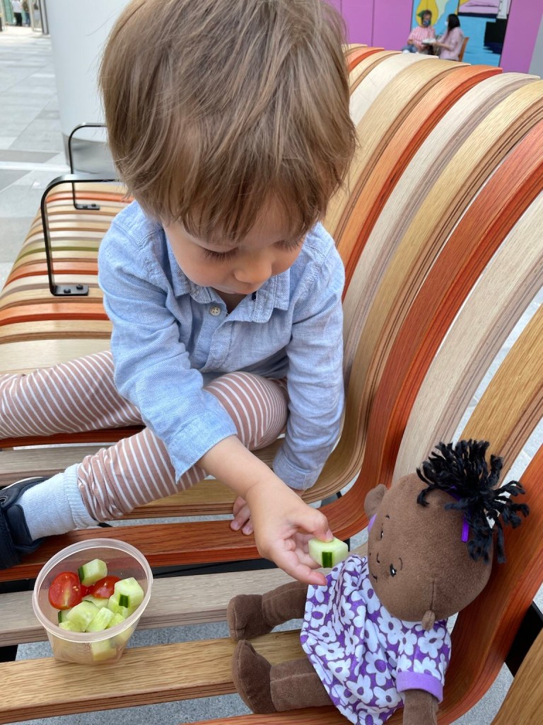 He is now negotiating with us. It is mostly him wanting to do things – for example, he may want to scoop coffee grounds into the Aeropress, to which I say no, and then he says, “See it though?” Then he peers into the coffee canister, and comments on how full or empty it is. Sometimes the compromise he seeks is unrelated to the original request; he says that he wants to fill the kitchen sink with soapy water, and is denied, and so he asks for yogurt.